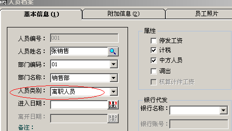 如果有人員離職的話,就到人員檔案中,修改該職員的相關(guān)信息。將人員類別改為“離職人員”,假設(shè)銷售部的張銷售已離職,改人員類別為離職人員
