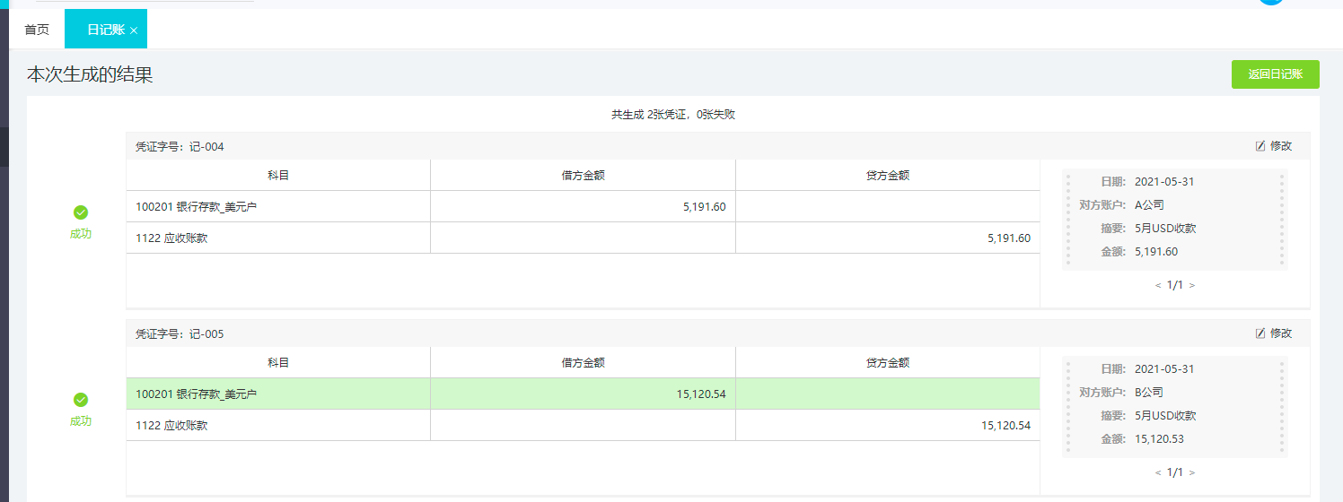 勾選需要生成憑證的流水,點(diǎn)擊右上角生成憑證,再點(diǎn)擊全部生成憑證,系統(tǒng)會(huì)根據(jù)“收支大類”和“收支類型”自動(dòng)創(chuàng)建對(duì)應(yīng)的憑證。