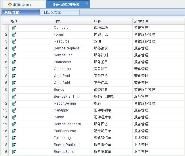 本列表展示除線索、客戶、聯(lián)系人、銷售機(jī)會(huì)對(duì)象外可分配管理維度的對(duì)象(包含系統(tǒng)對(duì)象、自定義對(duì)象)。