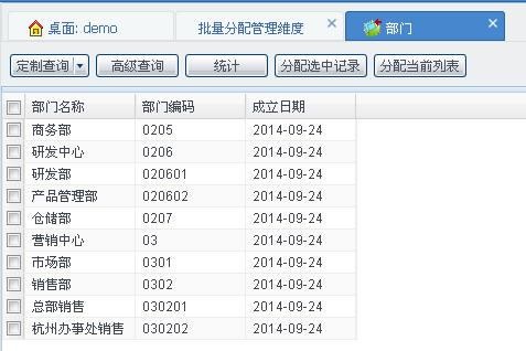 注釋:該頁(yè)面默認(rèn)顯示“批量分配部門”“批量回收部門”按鈕,如果 U8 平臺(tái)中還啟用了其他的管理維度,那么會(huì)顯示其他維度的批量分配、批量回收按鈕(如:批量分配區(qū)域結(jié)構(gòu))。