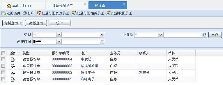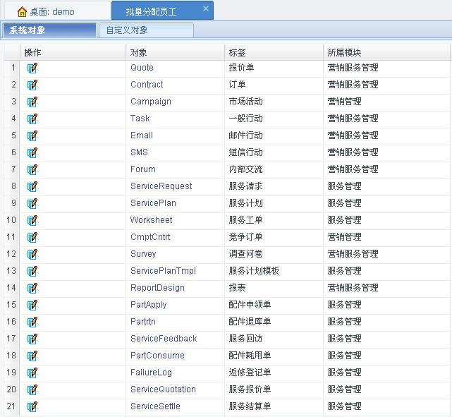 本列表展示除線索、客戶、聯系人、銷售機會對象外可分配員工的對象(包含系統(tǒng)對象、自定義對象)。