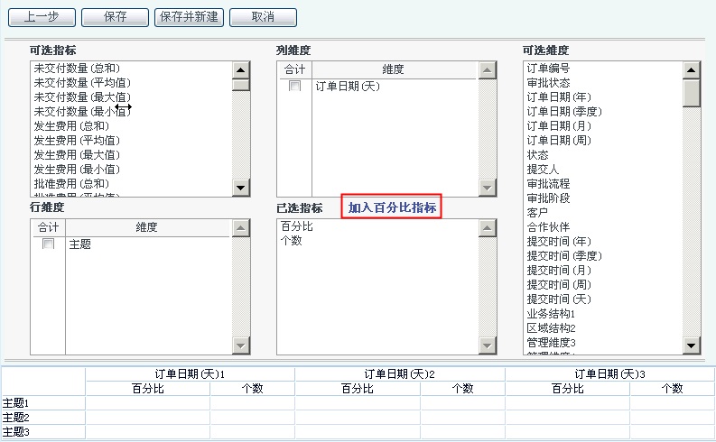 進(jìn)入報(bào)表布局設(shè)置頁(yè)面,在報(bào)表的可選指標(biāo)中選中一個(gè)或若干個(gè)指標(biāo),用鼠標(biāo)拖拽到已選指標(biāo)中,把可選緯度中的屬性拖拽到列緯度和行緯度中去,也可加入百分比指標(biāo)(按照需要設(shè)置指標(biāo)分子和分母),在設(shè)置報(bào)表的下方會(huì)即時(shí)顯示報(bào)表的樣子,設(shè)定完成后點(diǎn)擊[保存]按鈕。