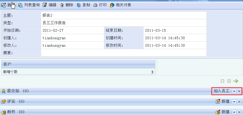在工作報(bào)告的查看頁面,點(diǎn)擊工作報(bào)告相關(guān)對(duì)象,提交給后的[加入員工]按鈕