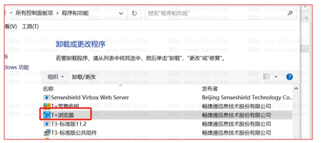 四、 若還有問(wèn)題,打開【控制面板】,點(diǎn)擊【程序和功能】,找到【T+瀏覽器】,雙擊點(diǎn)擊【卸載/更改】,隨后重新安裝【T+瀏覽器】即可。
