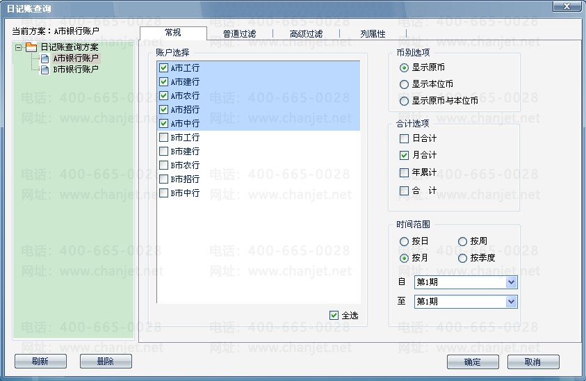 2、“賬戶選擇”勾選所有A市賬戶-“合計選項”按照需求勾選-“時間范圍”按照需求勾選-確定