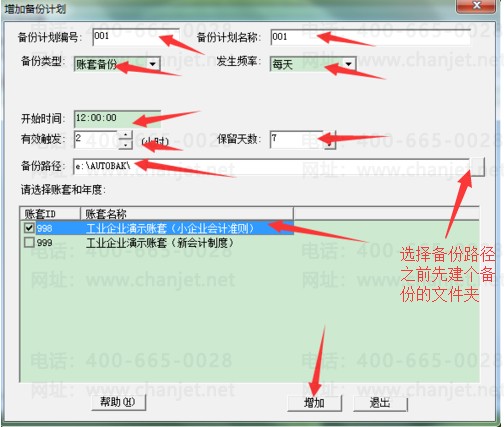 5、錄入備份計劃編號、備份計劃名稱、選擇備份類型(建議選擇帳套備份)、發(fā)生頻率(建議選擇每天,也可根據(jù)實際情況自行選擇)、開始時間(建議在不用財務(wù)軟件的時候,比如早晨剛上班的時候、中等吃飯時間,夜里,自動備份的時間點電腦一定要開機狀態(tài))、有效觸發(fā)、保留天數(shù)(視實際情況來定)、備份路徑、選擇要備份的帳套。點擊增加以后自動備份就設(shè)置完成啦。
