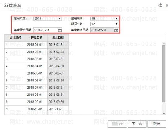 4、選擇賬套啟用年度以及啟用期間,并選擇期間個(gè)數(shù),通常期間個(gè)數(shù) 為 12,點(diǎn)擊【下一步】繼續(xù);