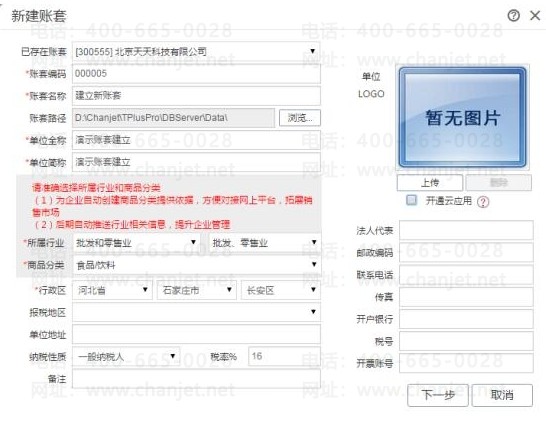 3、在建立賬套界面,將星號(hào)部分內(nèi)容填寫(xiě)完整,其中【開(kāi)通云應(yīng)用】 是否勾選,按照實(shí)際情況選擇,點(diǎn)擊【下一步】,繼續(xù)操作;