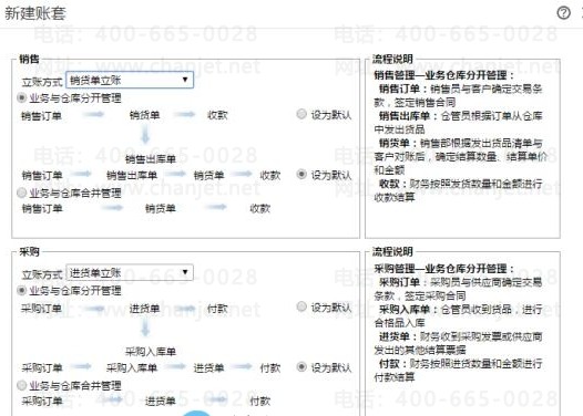 8、分別選擇銷(xiāo)售和采購(gòu)立賬方式,分為單據(jù)立賬和發(fā)票立賬,選擇流 程方式,分別為合并流程和分開(kāi)流程,具體區(qū)別可以參考操作界面說(shuō)明;