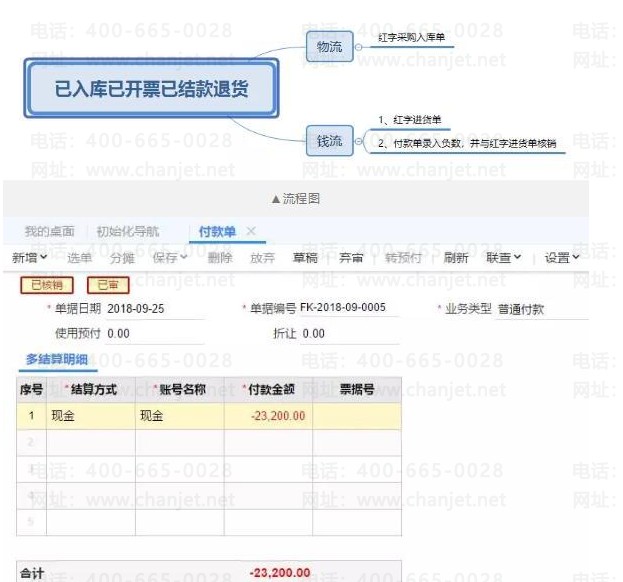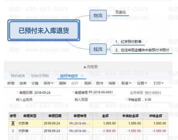 例:采購前已經(jīng)預(yù)付給供應(yīng)商一部分錢款,并且采購的貨物還未入到庫房,現(xiàn)在需要將預(yù)付款收回,并不再入庫。錢流:之前支付給供應(yīng)商時(shí)已經(jīng)做了一筆預(yù)付款單,預(yù)付款退回時(shí),需要再做一筆預(yù)付款單,錄入負(fù)數(shù)金額,并在往來現(xiàn)金模塊中點(diǎn)擊【應(yīng)付沖應(yīng)付】菜單,業(yè)務(wù)類型選擇【預(yù)付沖預(yù)付】,選擇兩筆紅藍(lán)預(yù)付款單沖銷。
