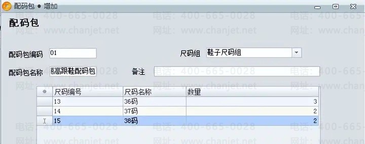 2、添加一個(gè)“百麗高跟鞋配碼包”,尺碼組選擇“鞋子尺碼組”,36碼、37碼、38碼數(shù)量分別為3、2、2。