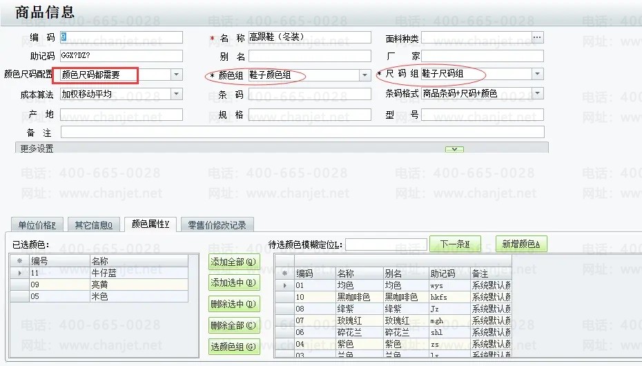 進(jìn)入【基本信息】—【商品信息】,添加一個(gè)商品為“高跟鞋(冬裝)”,顏色尺碼配置選擇“顏色尺碼都需要”,顏色組選擇“鞋子顏色組”,尺碼組選擇“鞋子尺碼組”保存。
