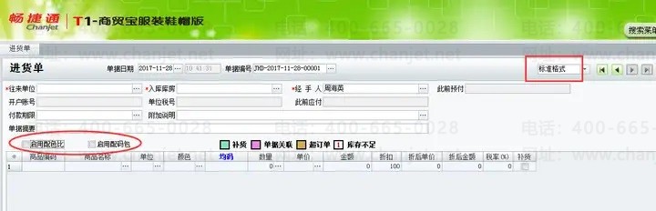 1、打開(kāi)進(jìn)貨單,頁(yè)面格式選擇標(biāo)準(zhǔn)格式,才有“啟用配色比”和“啟用配碼包”選項(xiàng)。