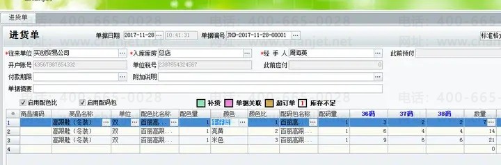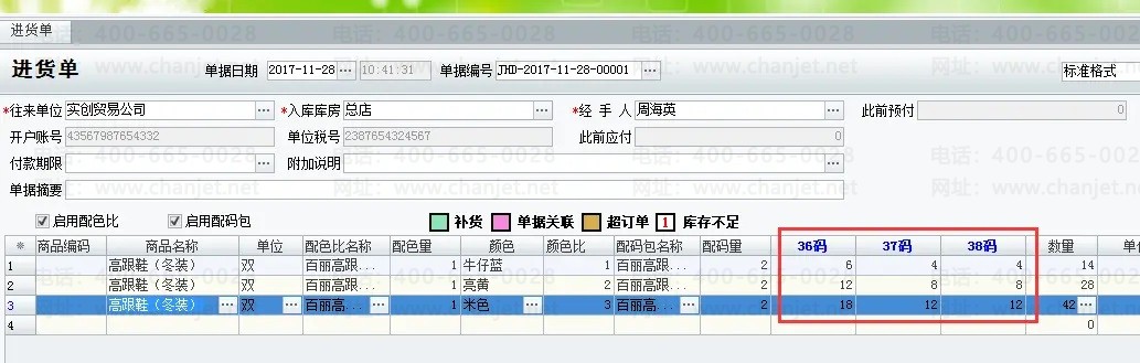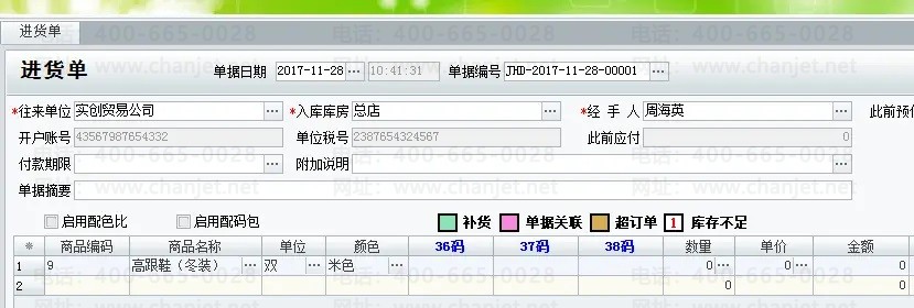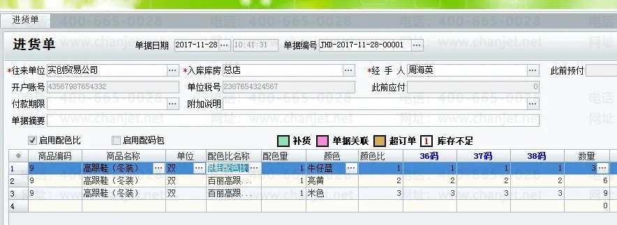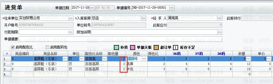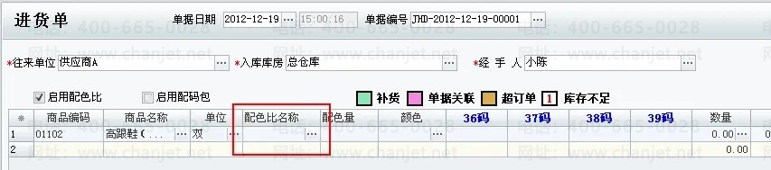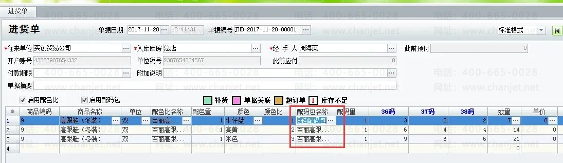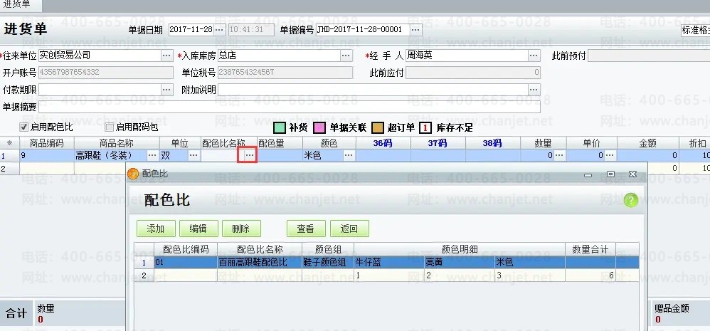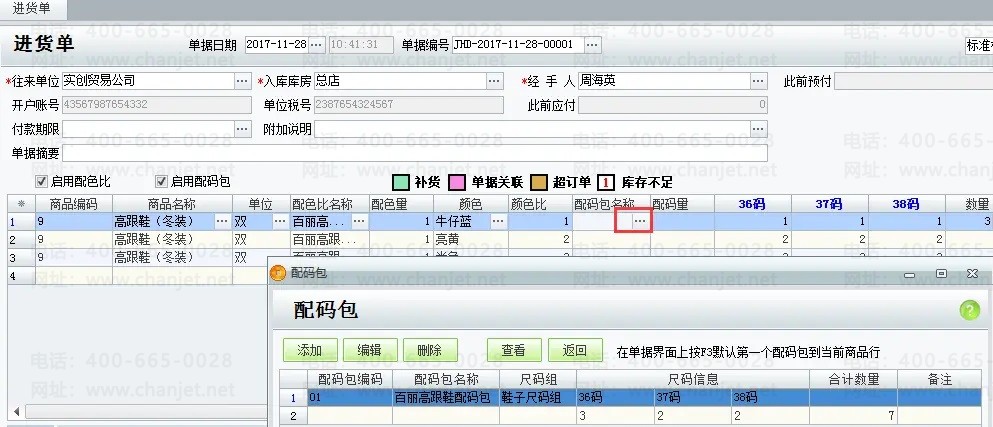 4、若供應(yīng)商供貨的顏色、尺碼在每個(gè)包裝中是固定,就可以使用配色比和配碼包來(lái)進(jìn)貨,免去手工錄入數(shù)量的麻煩。