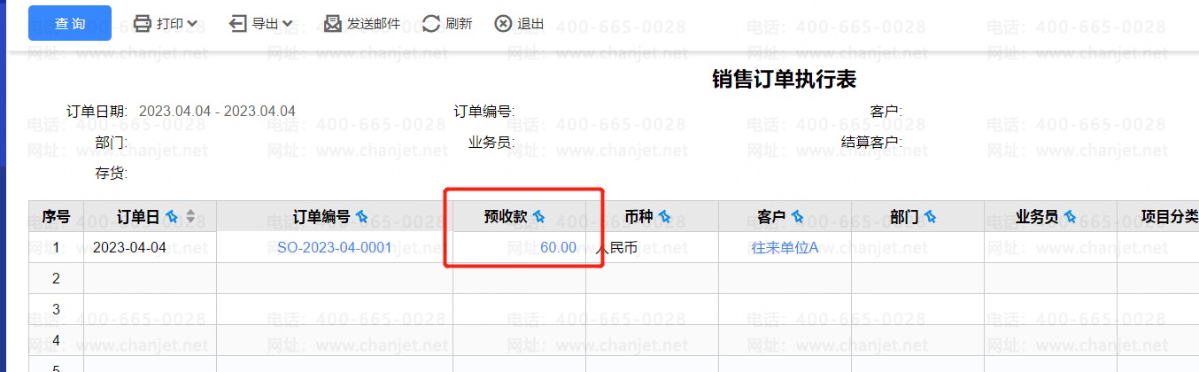 4.審核完成后查詢銷售訂單執(zhí)行表此時可以看到該訂單的收款情況