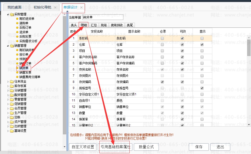 1、點擊系統(tǒng)管理中的單據(jù)設(shè)計,然后找到銷貨單,點擊明細(xì)后再點擊界面上“引用基礎(chǔ)檔案屬性”。