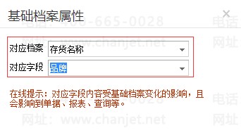 2、在彈出界面上,對應(yīng)字段中選擇存貨名稱,對應(yīng)字段中選擇品牌,然后點擊確定并保存。