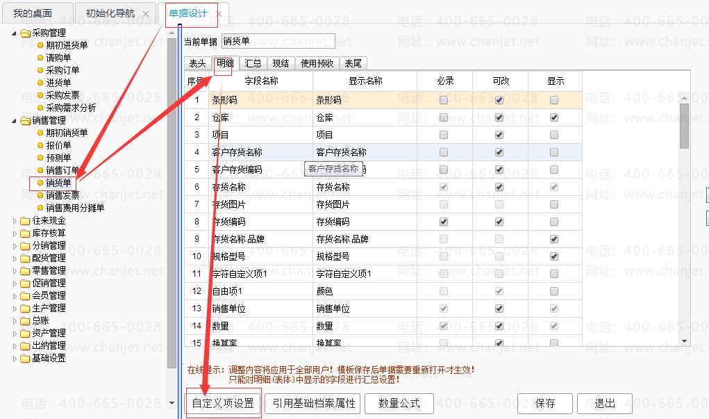 1、點擊系統(tǒng)管理中的單據(jù)設(shè)計,然后找到銷貨單,點擊明細(xì)后再點擊界面上自定義項設(shè)置。