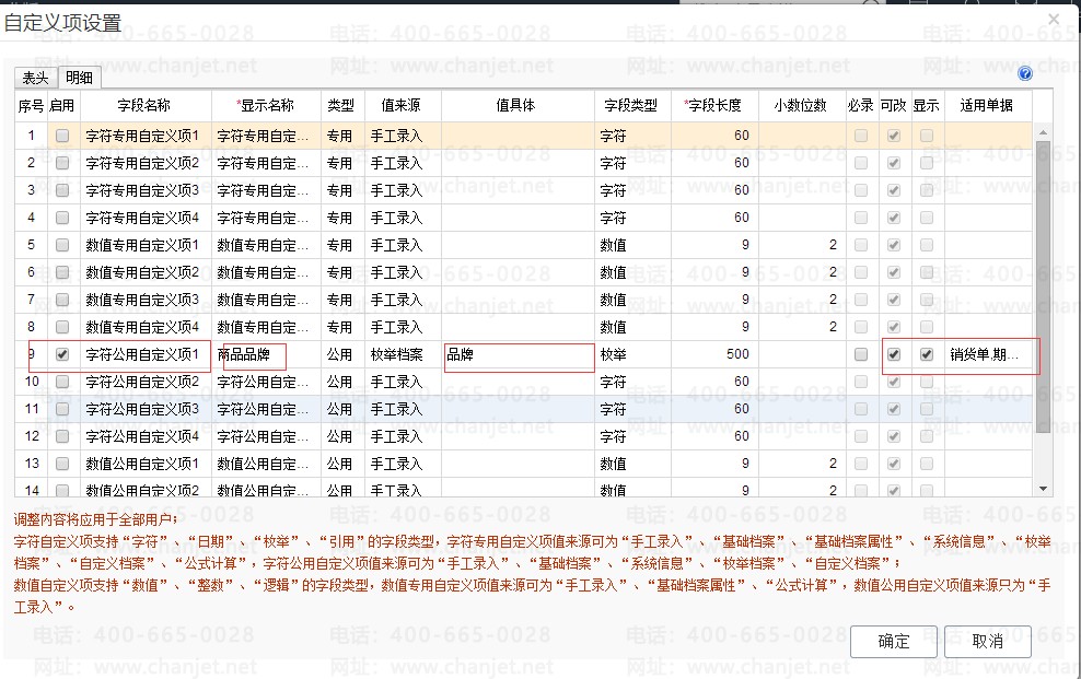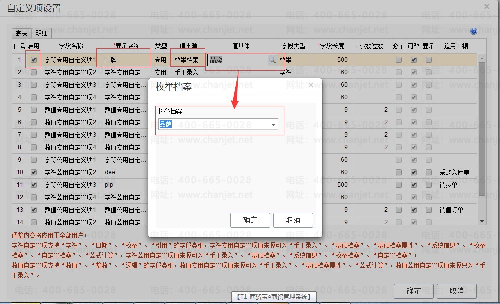 2、在彈出界面上,把專用自定義項1勾選上啟用,顯示名稱設(shè)置成品牌,值來源選擇枚舉檔案,值具體選擇品牌,勾選上顯示并保存。