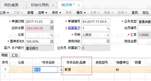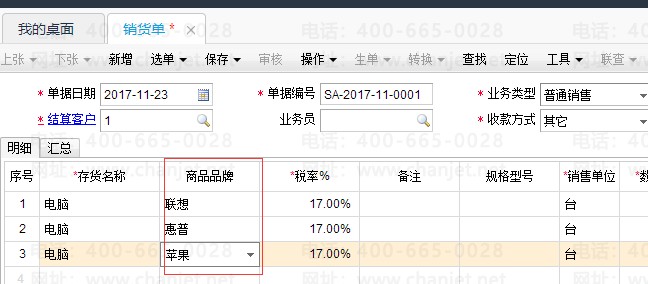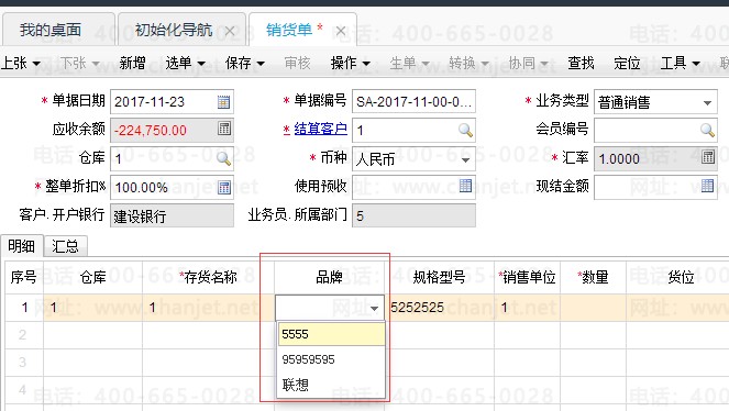 3、新增銷貨單的時候,在銷貨單的界面上可以對應(yīng)選擇所需的品牌。