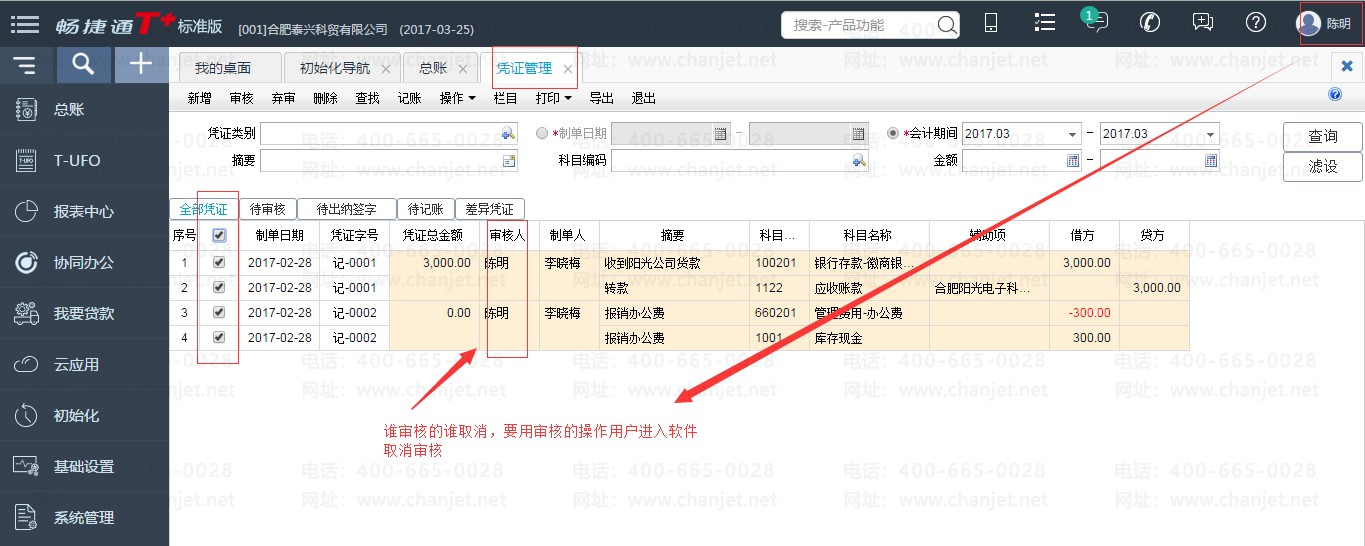 取消憑證記賬之后,在修改憑證之前,還需要取消憑證審核(注意:誰審核誰取消)。用當(dāng)初審核人的身份進(jìn)入軟件,進(jìn)入憑證管理,選擇需要取消審核的憑證,點【棄審】即可。