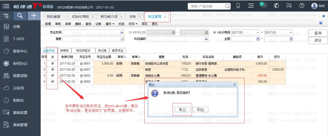 點總賬——>憑證管理,選擇需要取消記賬的憑證,按Ctrl+Alt+H ,彈出提示框,點擊是。
