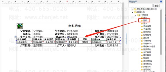 2.【明細(xì)設(shè)置】選擇【插入列】,打印模板設(shè)置界面內(nèi)點(diǎn)擊右側(cè)藍(lán)色長(zhǎng)條【屬性選擇】,在【子件明細(xì)】加入【層級(jí)】字段;