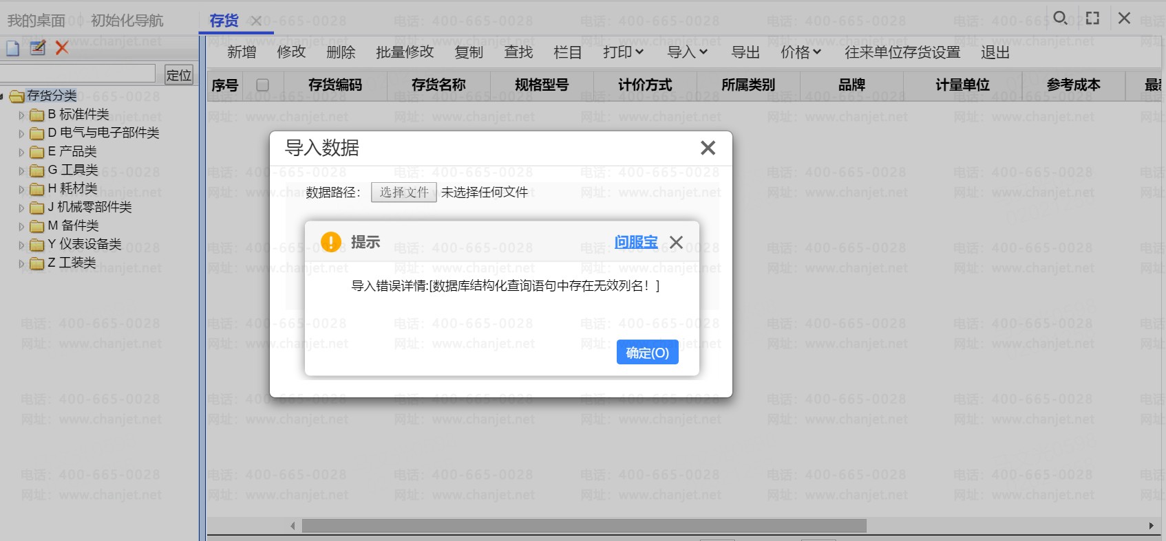 T+18.0 存貨檔案導入出錯:導入錯誤詳情:[數據庫結構化查詢語句中存在無效列名!]?