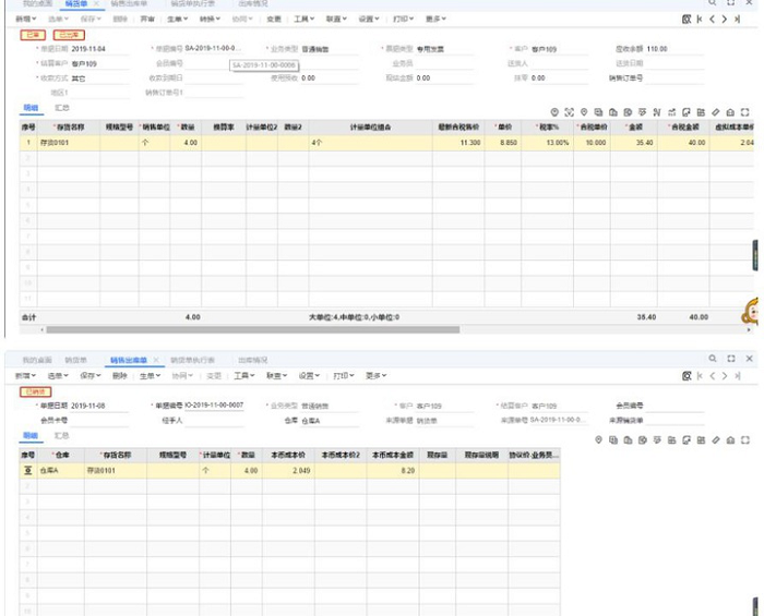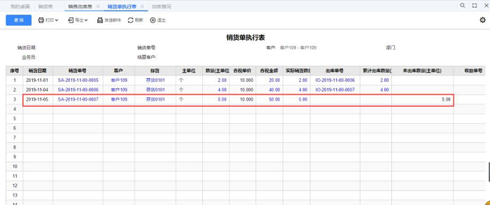 STEP2:查詢銷貨單執(zhí)行表查詢條件按出庫日期2019-11-08,輸入具體的客戶進行查詢,你會發(fā)現(xiàn),3張銷貨單都會出現(xiàn)在報表數(shù)據(jù)上。