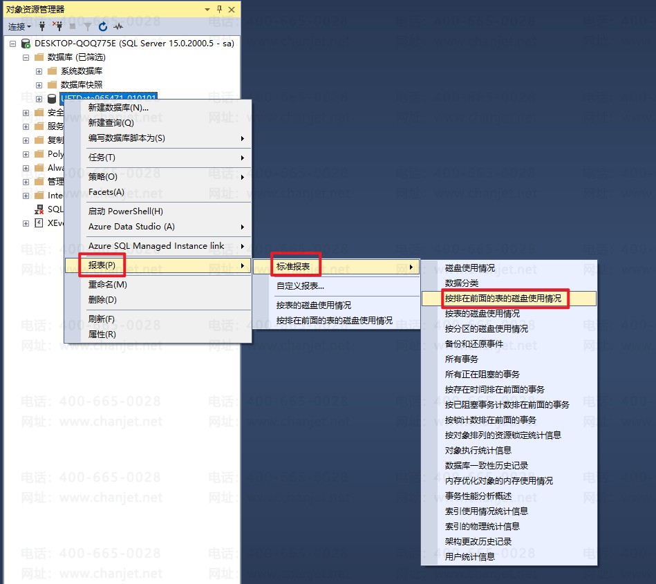 打開Microsoft SQL Server Management Studio,右鍵點擊帳套庫,依次點擊【報表】-【標(biāo)準(zhǔn)報表】-【按排在前面的表的磁盤使用情況】,系統(tǒng)會自動進行分析。