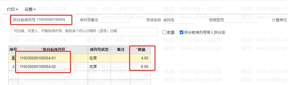 5、拆分時(shí),可以將該序列號(hào)拆成多筆記錄,總數(shù)量要與原本序列號(hào)存貨的數(shù)量一致