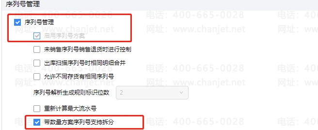 2、在【公共】頁簽中啟用序列號(hào)管理并同時(shí)啟用序列號(hào)方案和“帶數(shù)量方案允許拆分”功能,啟用后才有序列號(hào)拆分