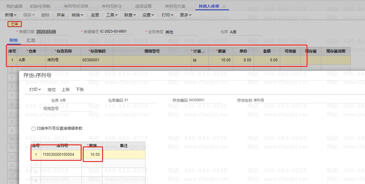 3、設(shè)置一個(gè)有數(shù)量的序列號(hào)方案,這樣存貨在入庫時(shí),一個(gè)序列號(hào)可以有多個(gè)存貨的數(shù)量,例如001序列號(hào)為10臺(tái)手機(jī)的序列號(hào)