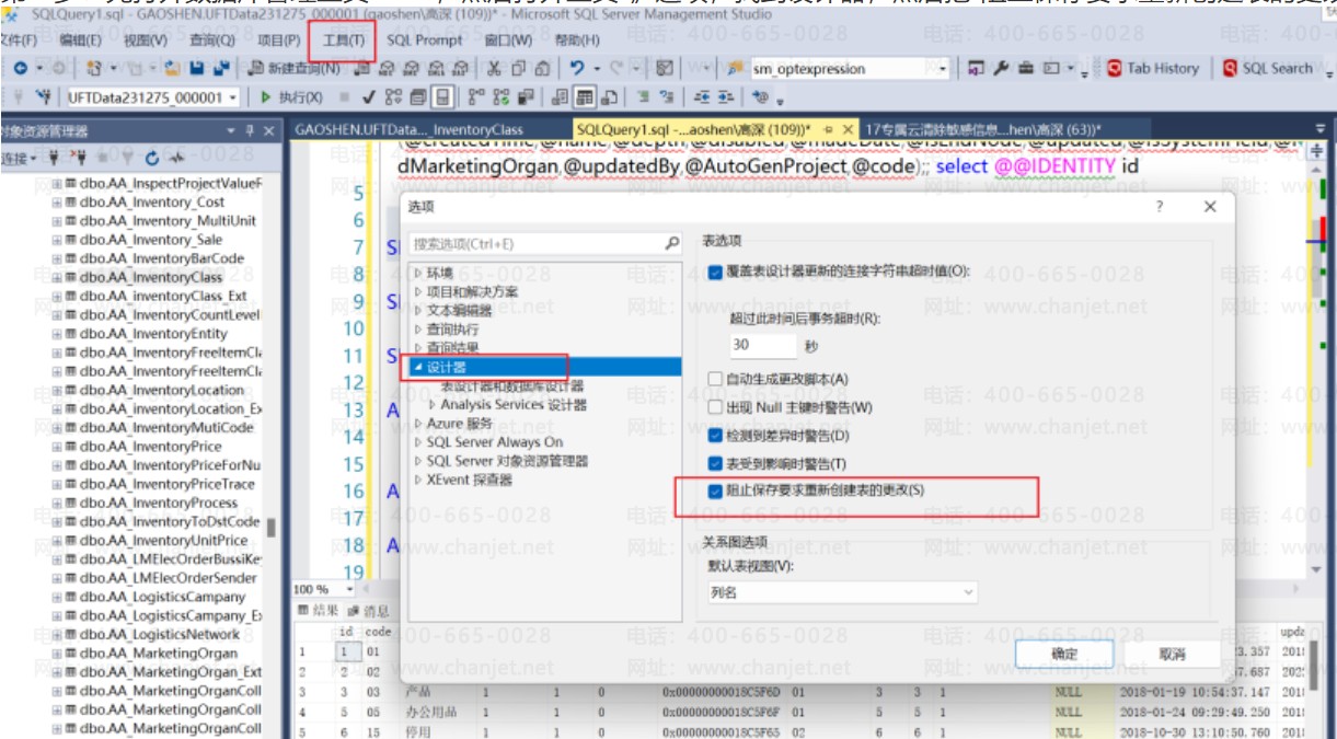 第一步:先打開數(shù)據庫管理工具SSMS,然后打開工具-》選項,找到設計器,然后把“阻止保存要求重新創(chuàng)建表的更改”取消勾選