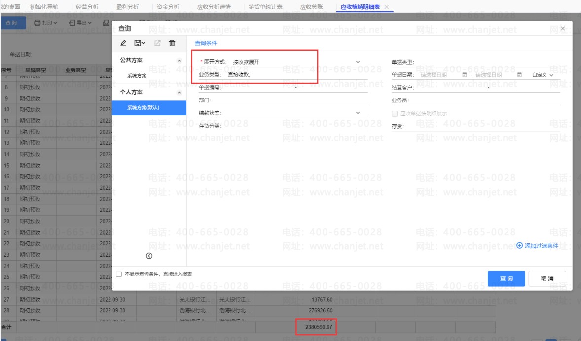 應(yīng)收核銷(xiāo)明細(xì)表中查詢(xún)出直接收款金額2380590.67