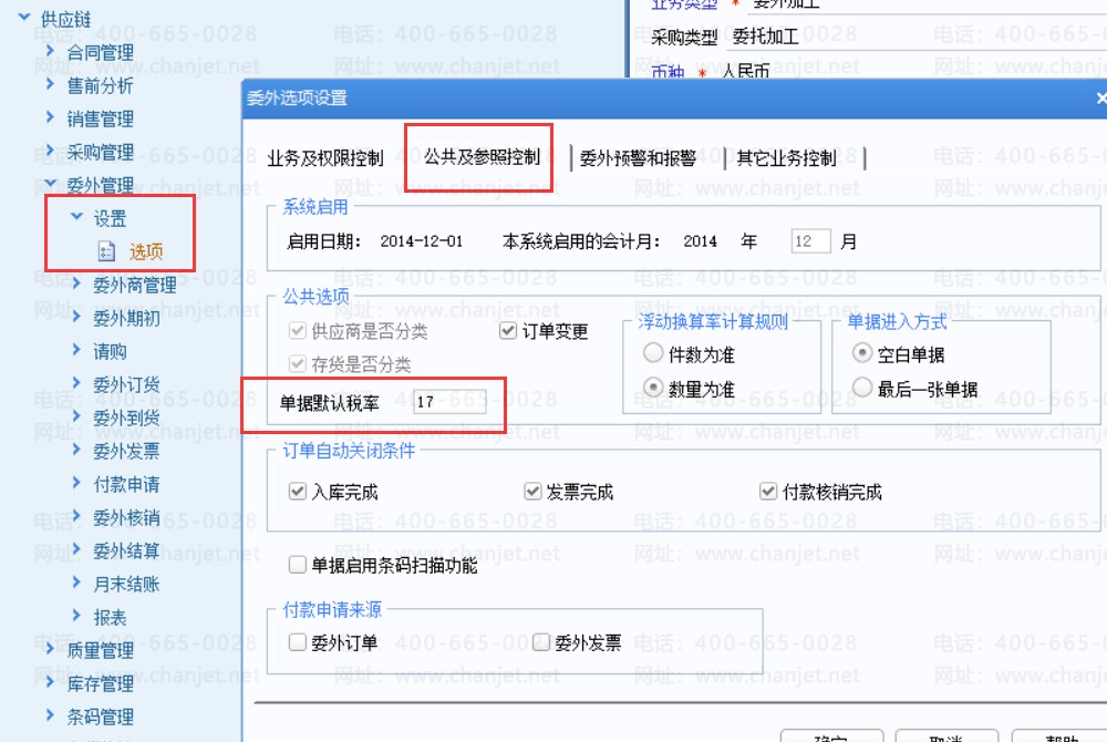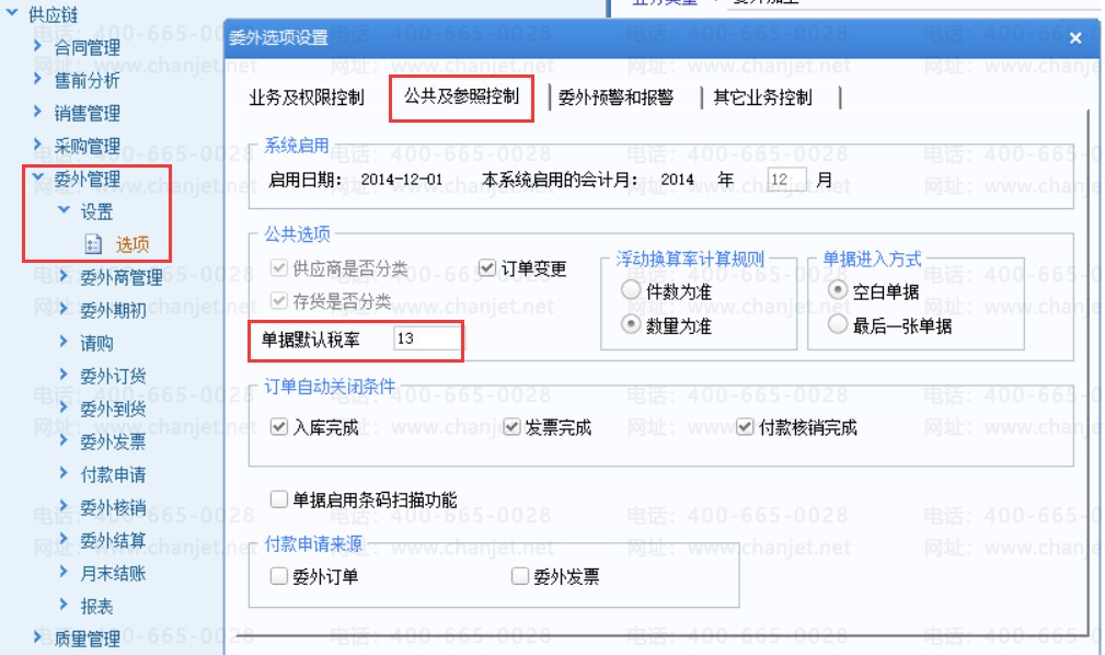 在委外管理-設(shè)置-選項-公共及參照控制頁簽 ,有【單據(jù)默認(rèn)稅率】選項,可以手工錄入,是必填項,系統(tǒng)默認(rèn)為17,可修改。設(shè)置此選項后,填制委外單據(jù)時會自動帶入委外單據(jù)的表頭稅率,可修改。但是有兩種委外單據(jù)不受單據(jù)默認(rèn)稅率修改的影響,普通委外發(fā)票的表頭稅率仍默認(rèn)為0,運費發(fā)票的表頭稅率仍默認(rèn)為7。
