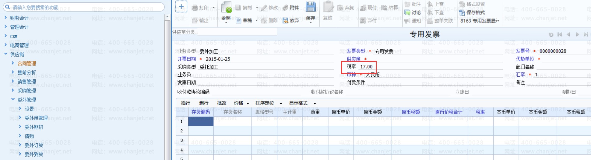 增加空白專用委外發(fā)票,表頭稅率默認(rèn)帶出為17