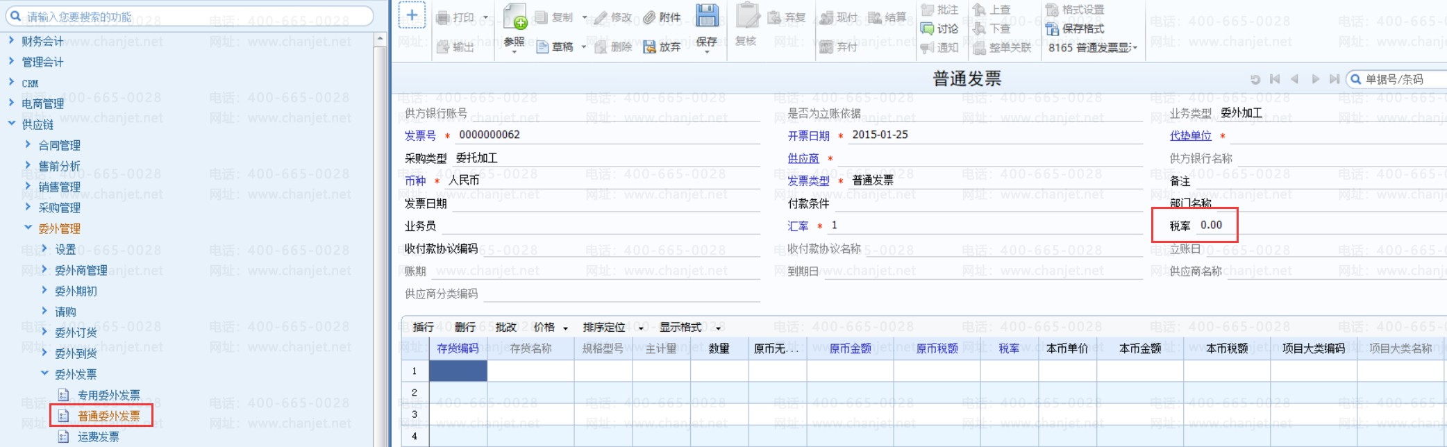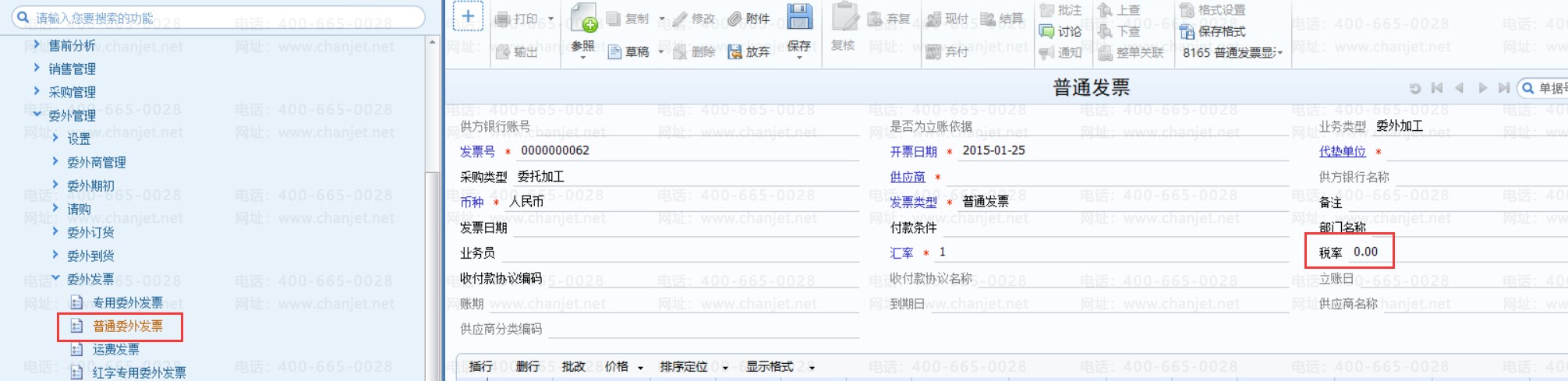 增加空白普通委外發(fā)票,表頭稅率默認(rèn)帶出為0