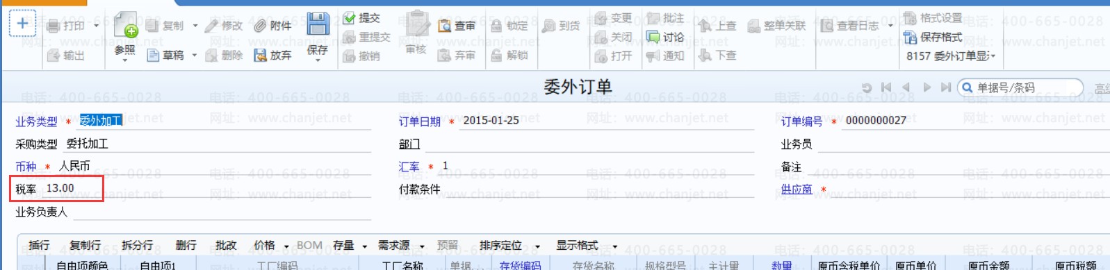 增加空白委外訂單,表頭稅率默認(rèn)帶出為13