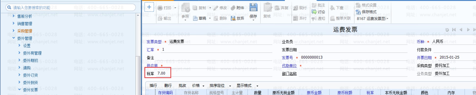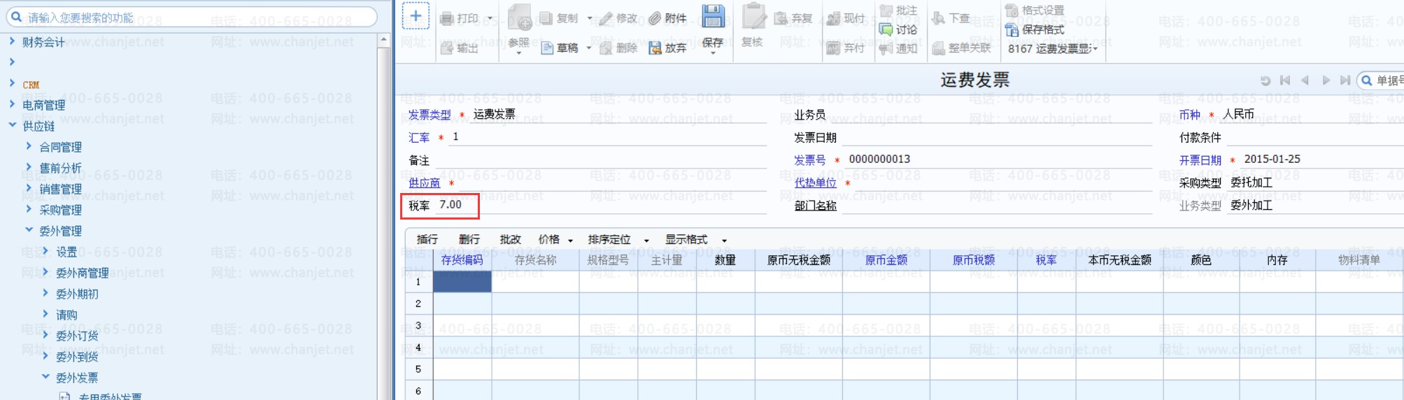增加空白運費發(fā)票,表頭稅率默認(rèn)帶出為7