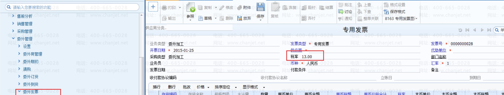 增加空白專用委外發(fā)票,表頭稅率默認(rèn)帶出為13