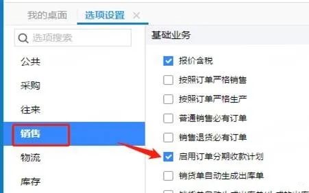 2、進(jìn)入選項(xiàng)設(shè)置后,點(diǎn)擊“銷售”頁(yè)簽,勾選上“啟用訂單分期收款計(jì)劃”并保存,如圖下: