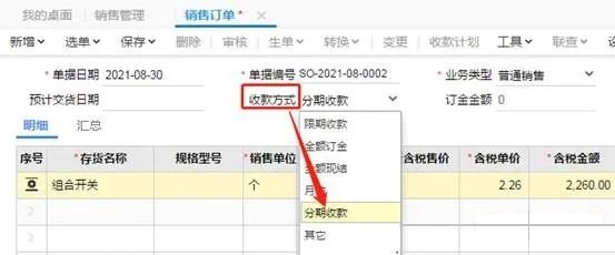 3、打開銷售訂單,錄入訂單相關(guān)信息,表頭收款方式切記選擇為“分期收款”,如圖下: