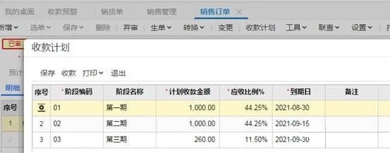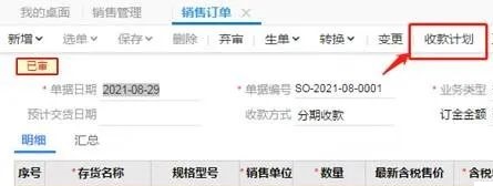 4、錄完訂單保存并審核后,點(diǎn)擊菜單欄中的“收款計(jì)劃”,如圖下:
