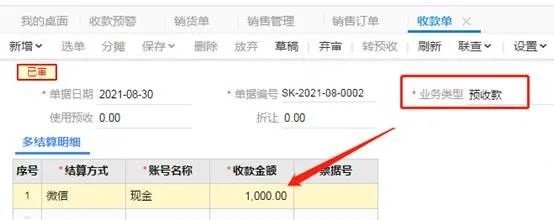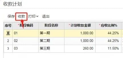 6、如果客戶預(yù)付了第一期款,先選中第一期點(diǎn)擊“收款”,系統(tǒng)自動(dòng)生成預(yù)收單,保存并審核,如圖下操作: