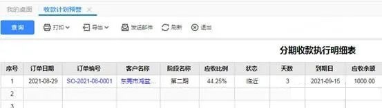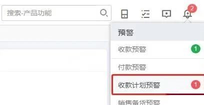 當(dāng)收款快到期時(shí),系統(tǒng)右上角的小鈴鐺變成紅色提醒,點(diǎn)開收款計(jì)劃預(yù)警,就可以看到哪一期即將到期了,如圖下: