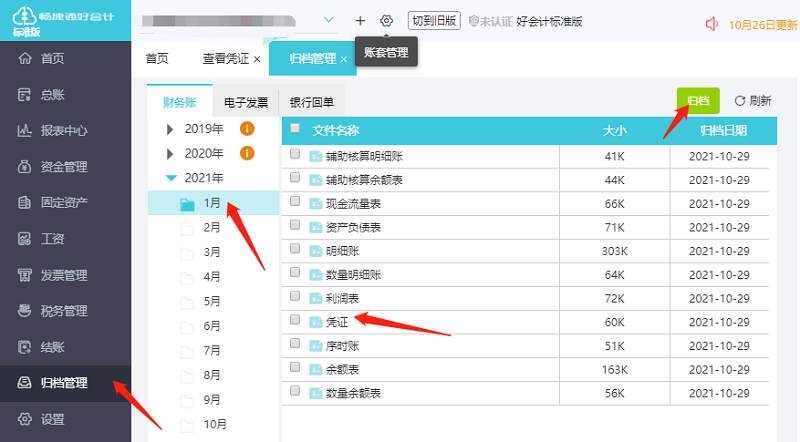 1、歸檔管理打印2021年1月憑證,依次點擊【歸檔管理】,選擇月份,再點擊右上角的【歸檔】,即可歸檔出月份的憑證下載PDF格式出來打印即可,如下圖: