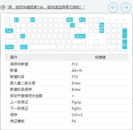 1、在【憑證】- 【新增憑證】頁面,鼠標移動至左上角鍵盤圖標處,即可查看到錄入憑證所有的快捷鍵。各個功能對應的快捷鍵如下: