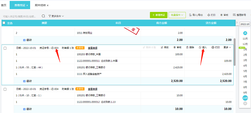 點擊【總賬】-【查看憑證】界面,鼠標放在3號憑證上,點擊【插入】即可。新插入的憑證會自動編號替代被插入的憑證,被插入的憑證編號自動后延。