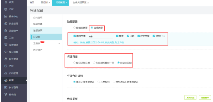 01 日記賬憑證配置新增選擇摘要和憑證日期設(shè)置,可按要求設(shè)置生成憑證。
